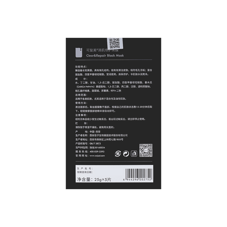 KOMFYMED可複美 清肌修護黑膜 深層清潔面膜 控油補水 保濕提亮 5片入