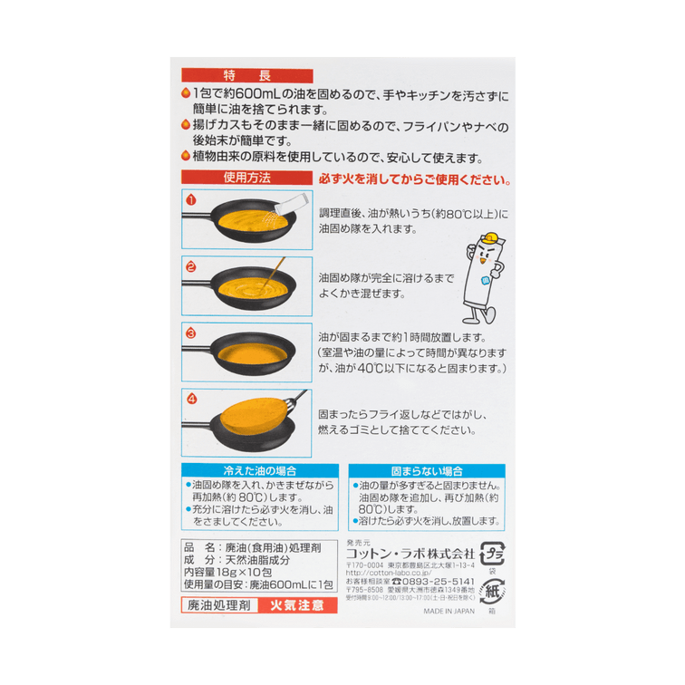 日本COTTON LABO 廢油處理劑凝固劑 10包入 180g 牛油火鍋處理神器【火鍋必備】