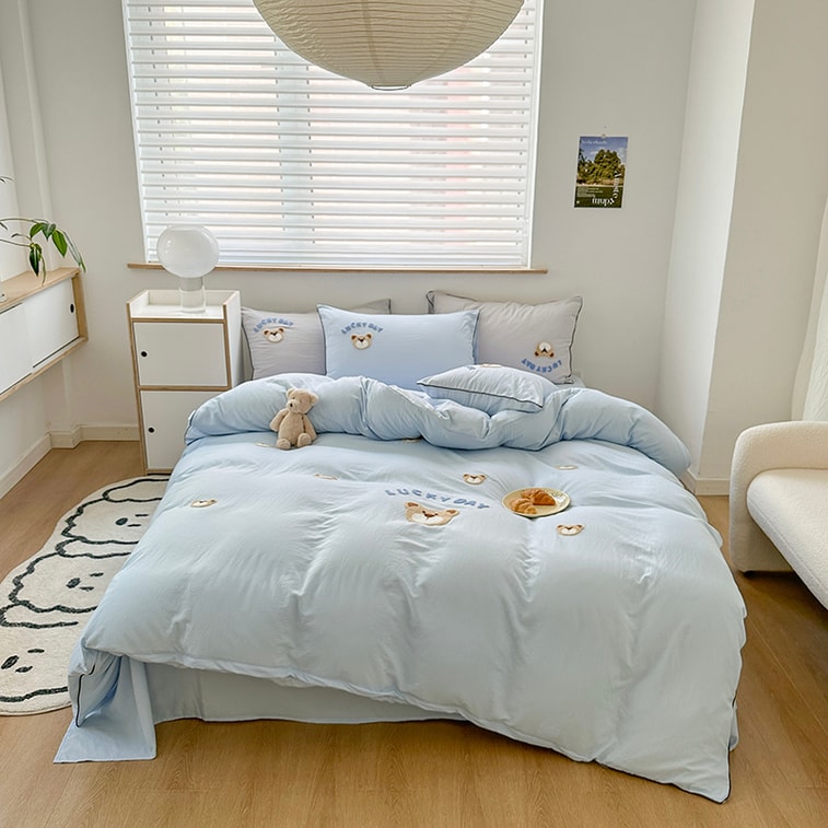 奶噗的小熊作為毛巾繡圖案搭配在淺色繫床品上,可愛大方,為臥室帶來溫馨的氛圍。