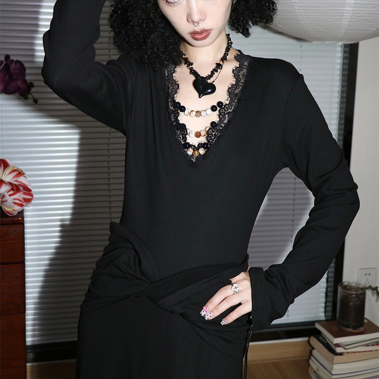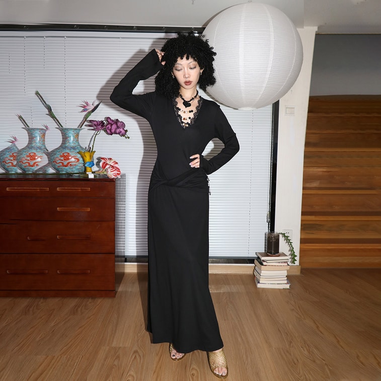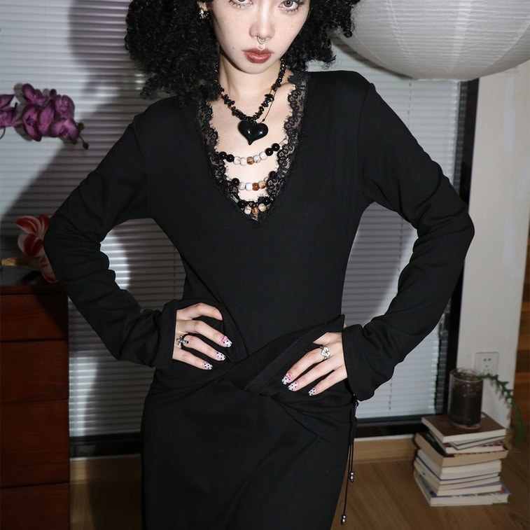 【中國直郵】 HSPM 暗黑辣妹 V領珠 質長袖修身打底彈性洋裝 加厚加絨洋裝 黑色S