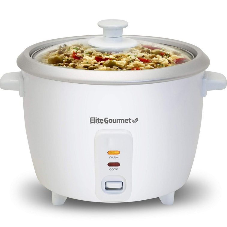 Cook perfect, fluffy rice every time with the Elite Cuisine Deluxe 6 Cup Rice Cooker. Makes up to 6 cups of cooked rice (using 3 cups of uncooked rice). No more waiting for water to boil or watching the pot on the stovetop, this unit automatically cooks rice and switches to "Keep Warm" when cooking is complete, keeping food hot and fresh before serving. It includes an easy to clean removable cooking pot, an easy to read measuring cup and spatula for easy serving and a tempered glass lid for convenient viewing.