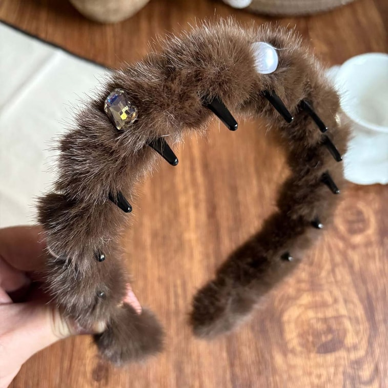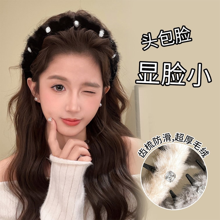 【中國直郵】 HSPM 精緻珍珠水鑽毛絨波浪髮箍女高顱頂壓髮帶齒防滑頭箍髮飾頭飾 深卡色一個