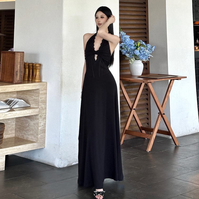 【中國直郵】 HSPM 法式黑色海邊度假裙 涼感布料V領洋裝 設計感小眾禮服 長款掛脖裙 黑色L
