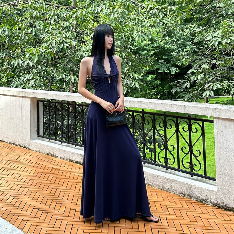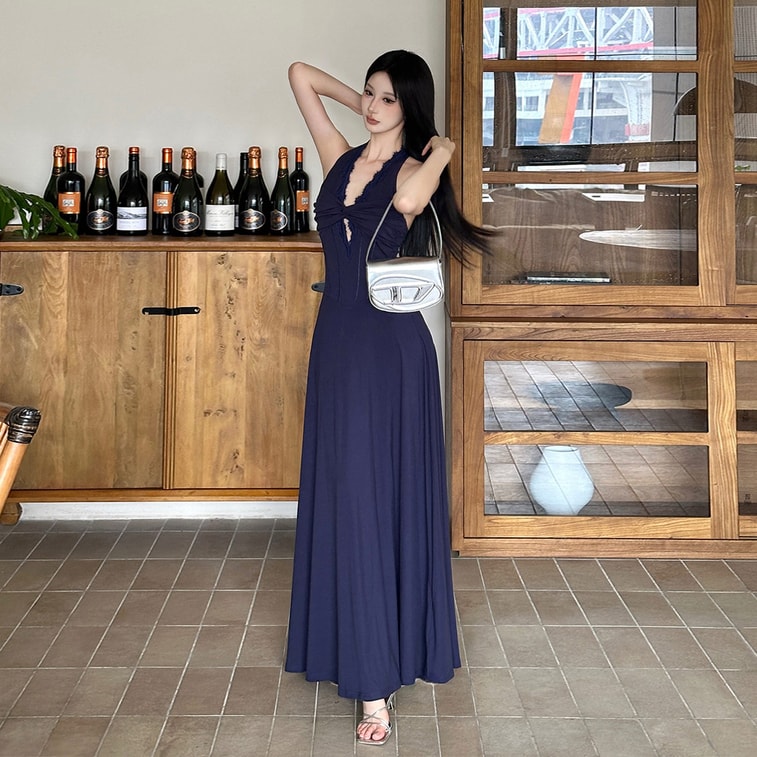 【中國直郵】 HSPM 法式黑色海邊度假裙 涼感布料V領洋裝 設計感小眾禮服 長款掛脖裙 藏藍色S