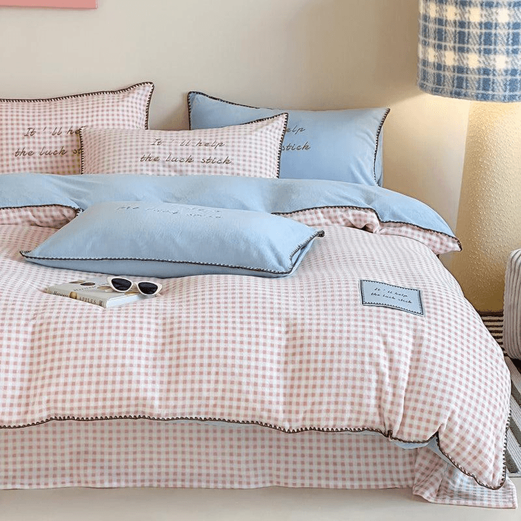 【中國直郵】 Lullabuy 撞色格子條紋床上四件套 床品被套枕套(床單款)桃霧海鹽-Queen | 亞米