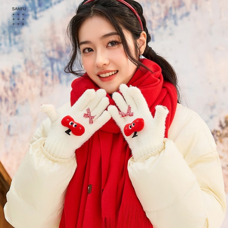 【中國直郵】 三福 趣味結形五指手套 可愛戶外保暖手套 卡通結白 均碼一雙裝