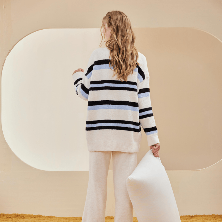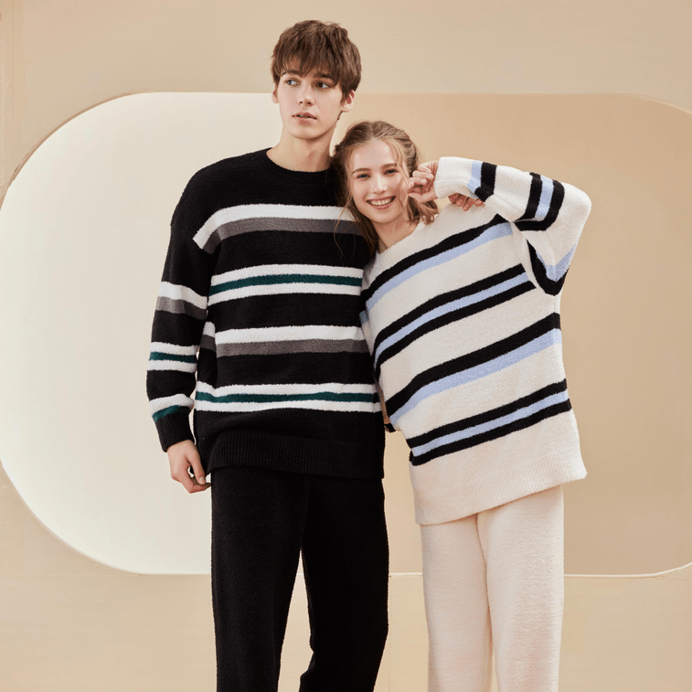 【中國直郵】Lullabuy 黑白條紋秋冬情侶睡衣男女同款家居服長袖長褲 均碼 女白條紋