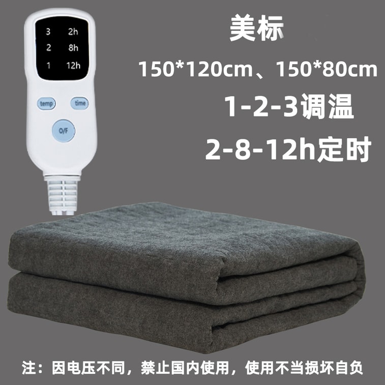 【中國直郵】 HSPM 電熱毯美標110V電褥子發熱毯保暖床墊 灰色150x80cm 3檔定時 1件
