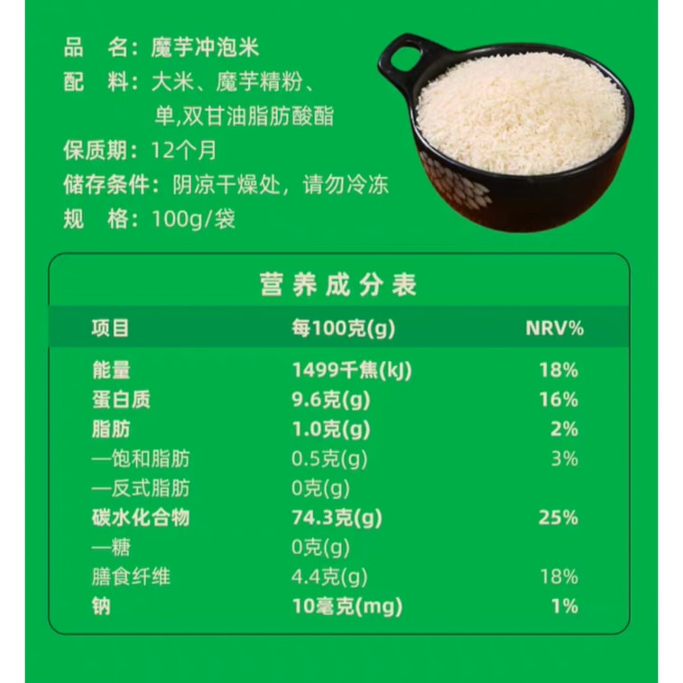 Instant konjac rice, no-cook, bagged konjac rice, suitable for students' dormitories and outdoor use, convenient for lazy people, no-steam, ready-to-cook rice, 100g*1 bag
