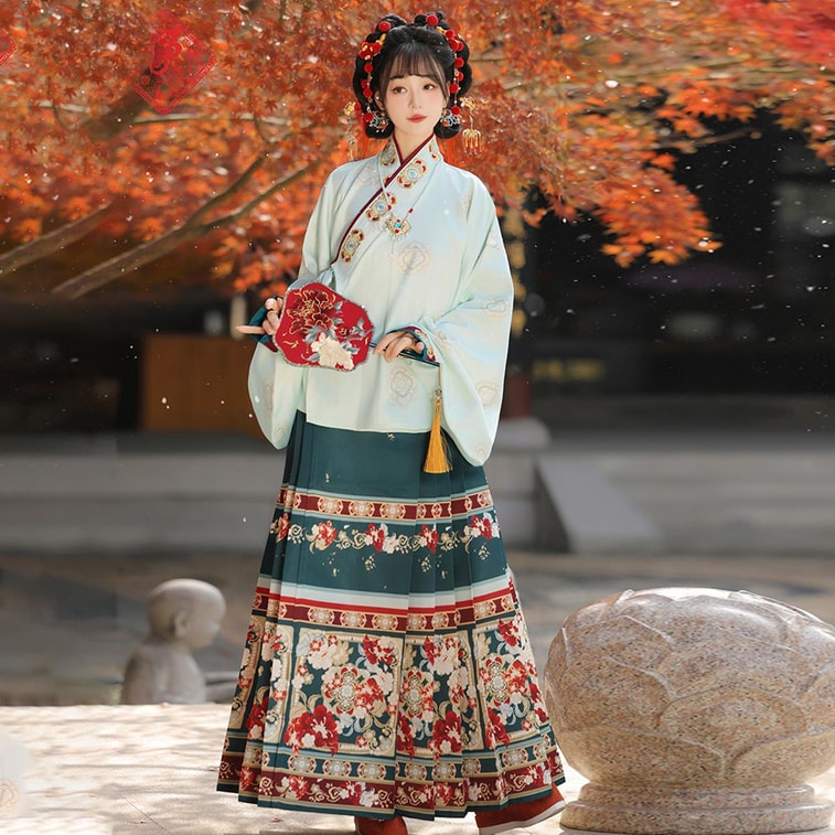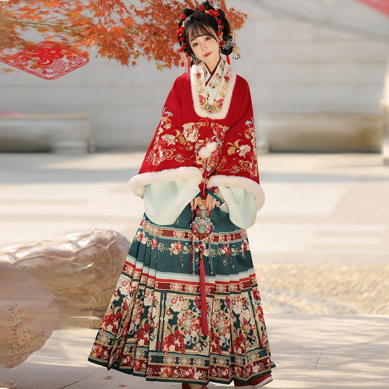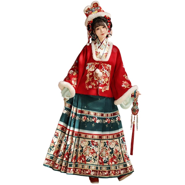 【中國直郵】 HSPM 玉指捻-繁花似錦明製漢服加厚馬面裙套裝 紅色上襖+裡衣+綠色馬面裙 S