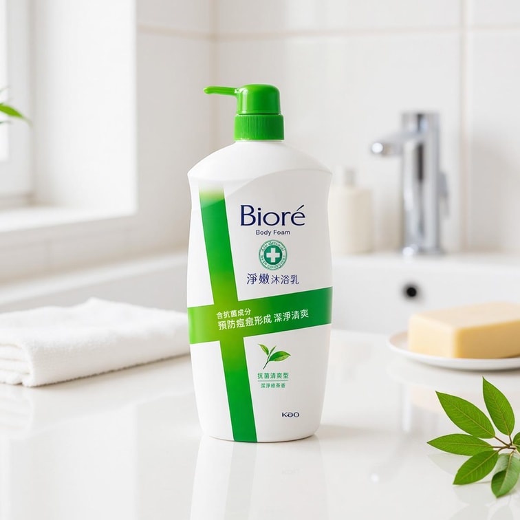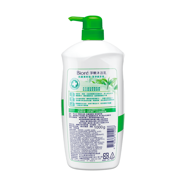 日本KAO花王 BIORE碧柔 淨嫩沐浴乳 抗菌清爽型 預防痘痘 潔淨清爽 抗菌成分 潔淨綠茶香 1000g