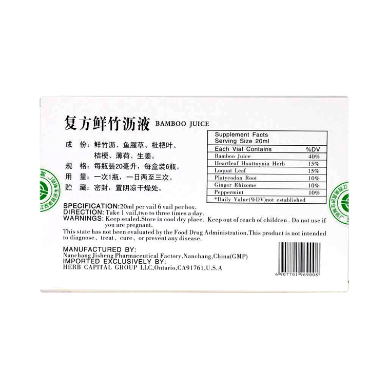 江西濟生 複方鮮竹瀝液 風熱感冒胸悶口乾痰熱咳嗽 上呼吸道感染 20ml x 6 Bottles