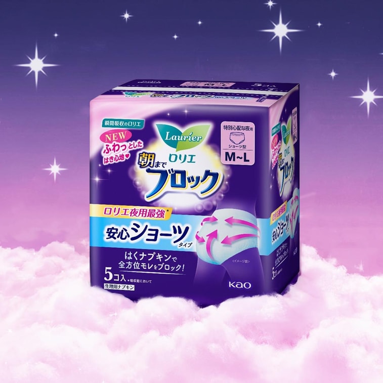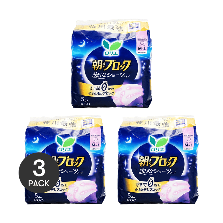 日本KAO花王LAURIER樂而雅A超吸收安睡系列夜用吸收最強全方位保護安睡褲晚安褲褲型衛生棉M~L號5片入*3包入(包裝隨機發送)【超值3包入】