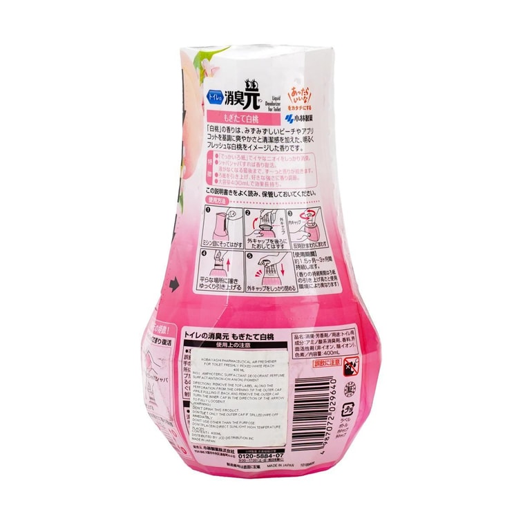 ["強效分解廁所異味,迅速淨化空氣,清新宜人"," 400ml大容量設計,持久消臭,無需頻繁更換","散發清新白桃香氣,營造舒適愉悅的衛生間環境","專為衛生間設計,有效改善異味,提升空間品質","消臭與香味雙重功效,一瓶解決芳芬"]["Powerful odor eliminator, rapidly purifies air for instant freshness.","Generous 400ml capacity ensures long-lasting odor control, minimizing frequent refills.","Infused with a delightful white peach fragrance, creating a pleasant and inviting bathroom ambiance.","Specially formulated for bathrooms, effectively tackling odors to elevate your space quality.","Dual-action formula: neutralizes odors while releasing a lasting, refreshing scent.","Transform your bathroom into a clean, fresh, and welcoming sanctuary with ease."]