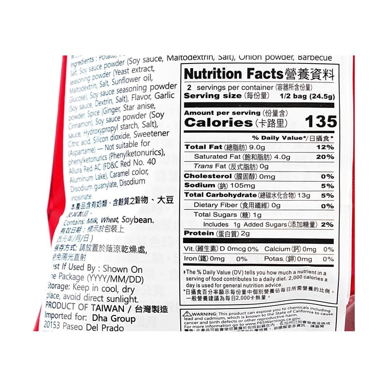 *免責聲明:本頁面所展示的營養成分資訊來自商品包裝,僅供參考。由於包裝版本、語言或拍攝方式的差異,內容可能存在偏差或顯示不完整,請以實際收到的商品包裝為準。若對成分、過敏原或適用族群有疑問,建議於使用前仔細閱讀包裝說明,或聯繫客服取得協助。