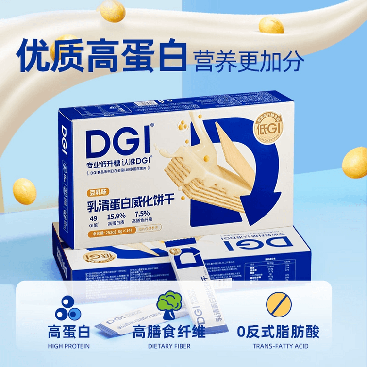 【中國直郵】 DGI 低GI乳清蛋白威化餅乾(豆乳味) 補充能量 無糖代餐 飽腹 糖友零食 1盒