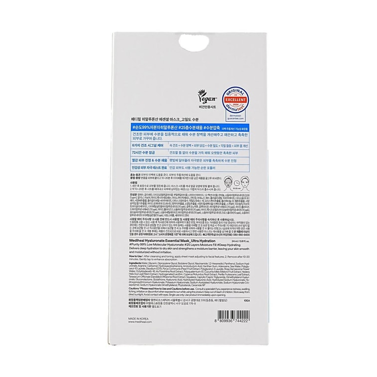 韓國MEDIHEAL美迪惠爾 99%純玻尿酸保濕面膜 3.0升級精粹版 10片/盒 水潤呵護