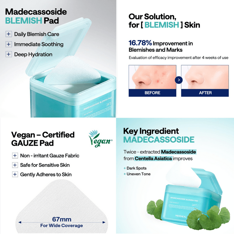 使用Mediheal 經皮膚科醫生測試的祛痘爽膚棉片,展現更潔淨、舒緩、更健康的肌膚