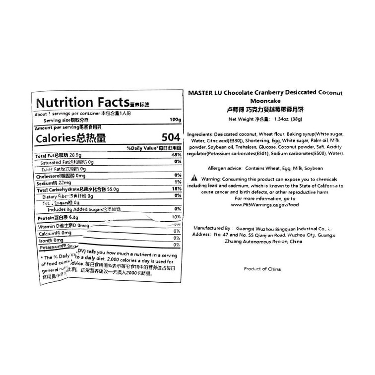 盧師傅 巧克力蔓越莓椰蓉月餅 38g *5【5份超值裝】【河南老字號 中秋傳統月餅】【超高性價比】