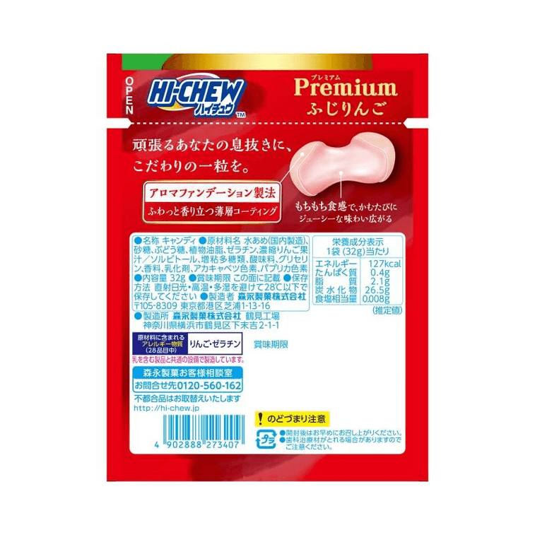 材料:澱粉糖漿(日本產)、白砂糖、葡萄糖、植物油、明膠、濃縮蘋果汁/山梨糖醇、增稠劑、酸度調節劑、甘油、食用香精、乳化劑、紅甘藍色素、辣椒粉色素