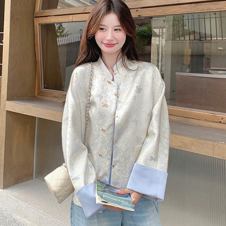【中國直郵】 HSPM 全新中式外套 國風緞面印花拼接外套 時尚減齡短版外套上衣 藍色XL