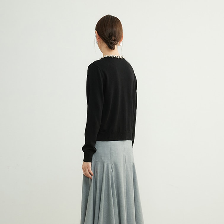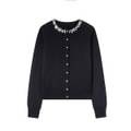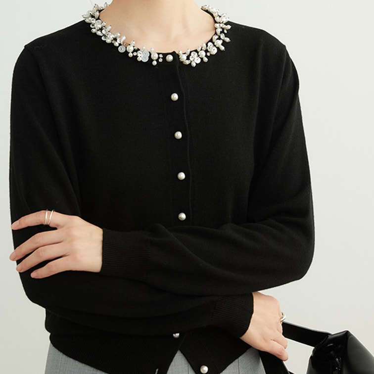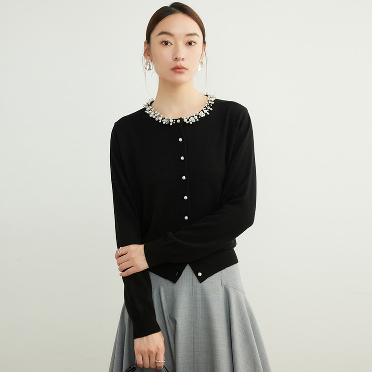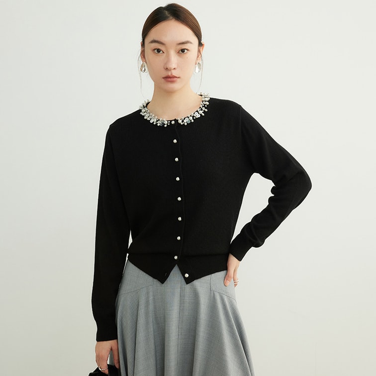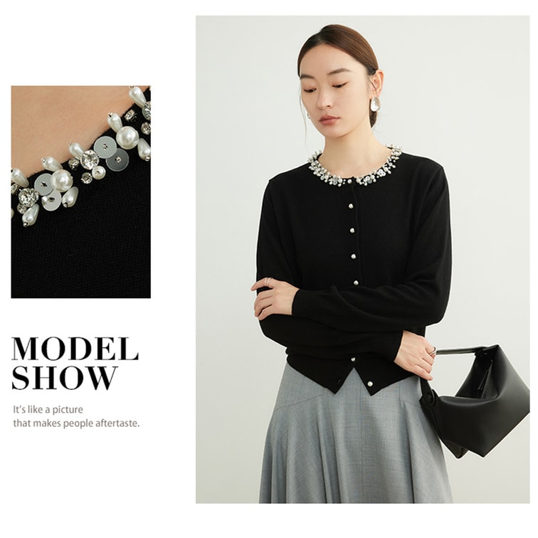 【中國直郵】 HSPM 新款高級感miu系女裝針織衫釘珠羊毛開襟衫薄款顯瘦針織衫 黑色 L