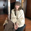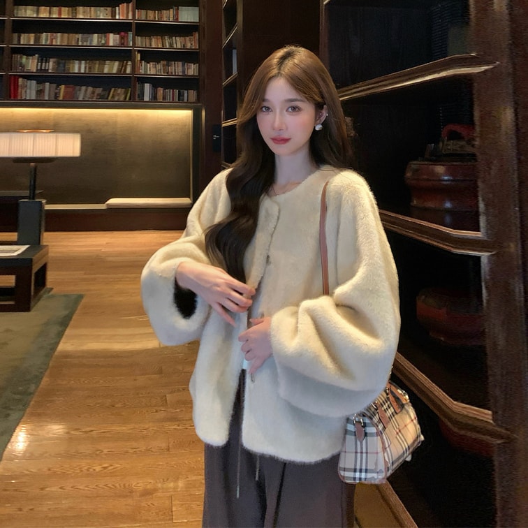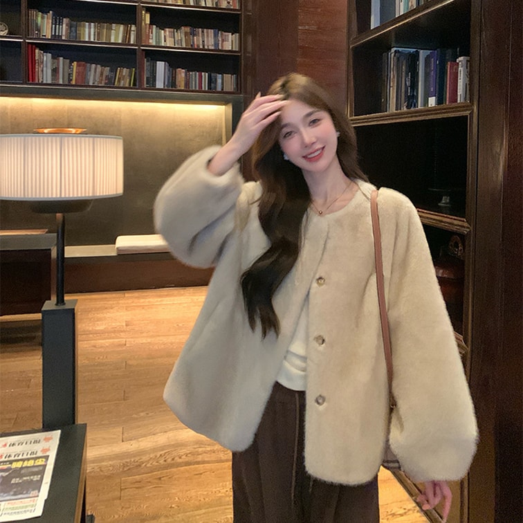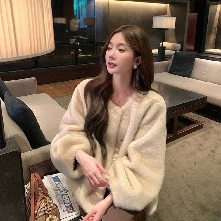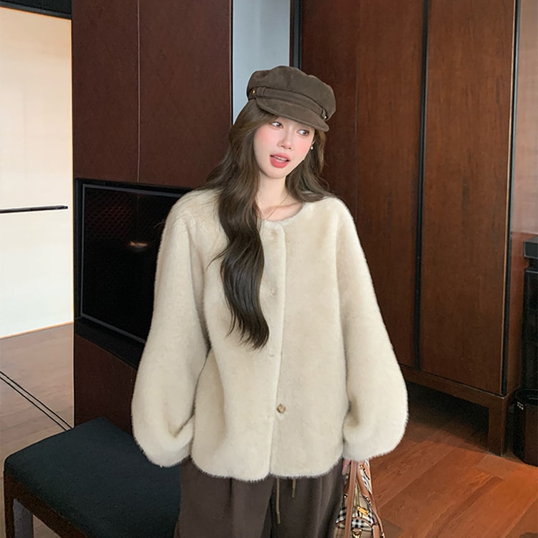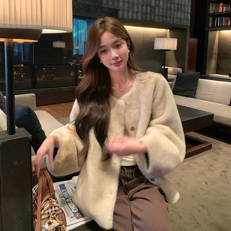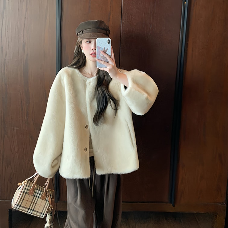 【中國直郵】 HSPM 新款中古風仿水貂短版環保貂皮大衣寬鬆毛毛皮草外套 奶白色 M