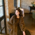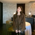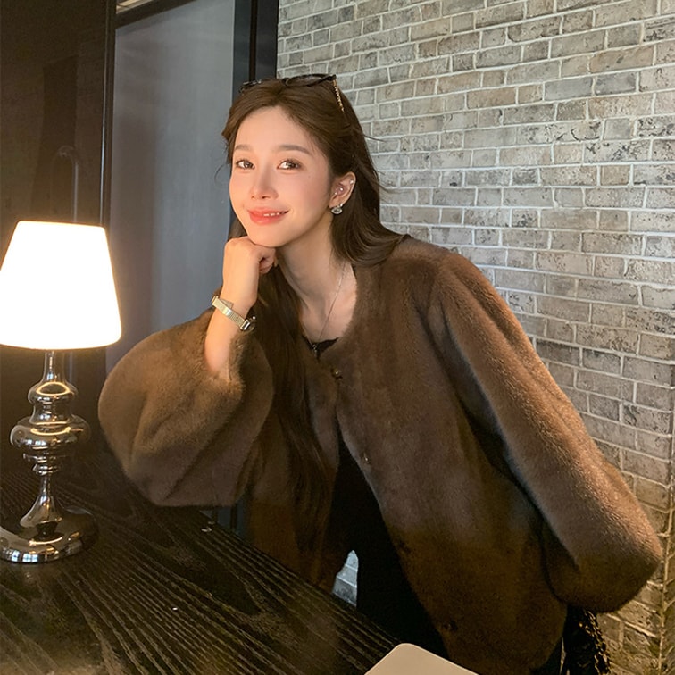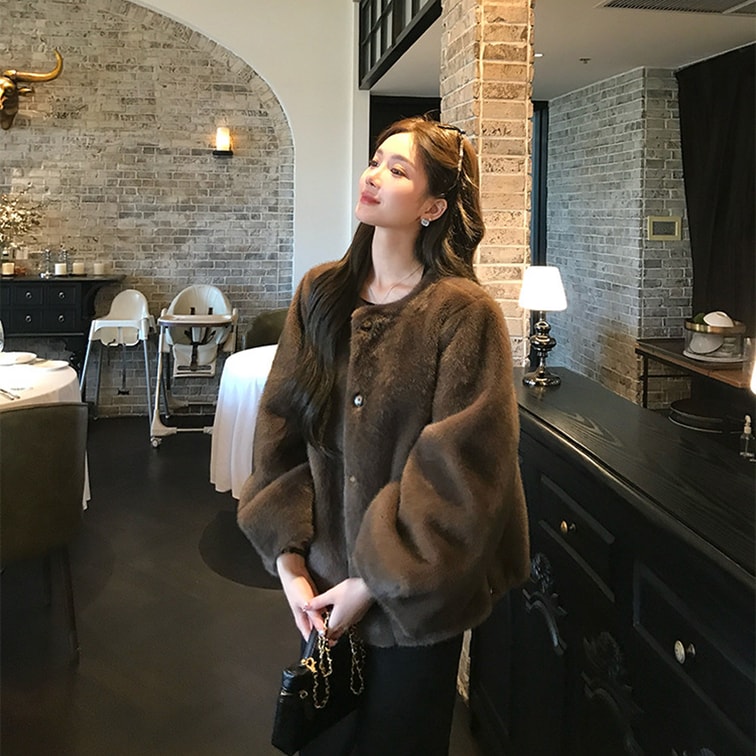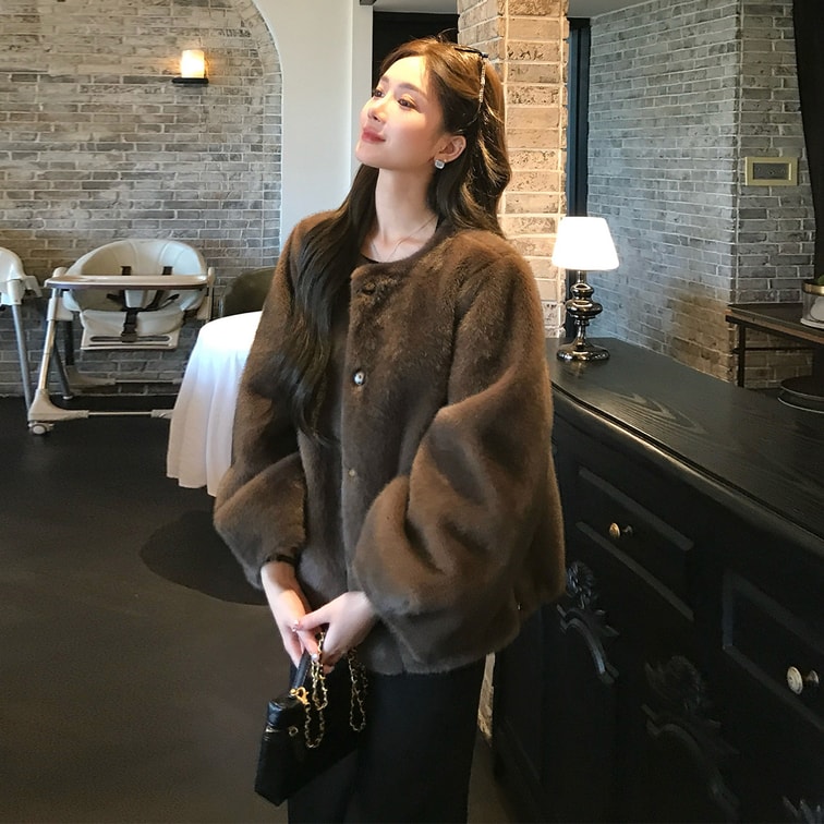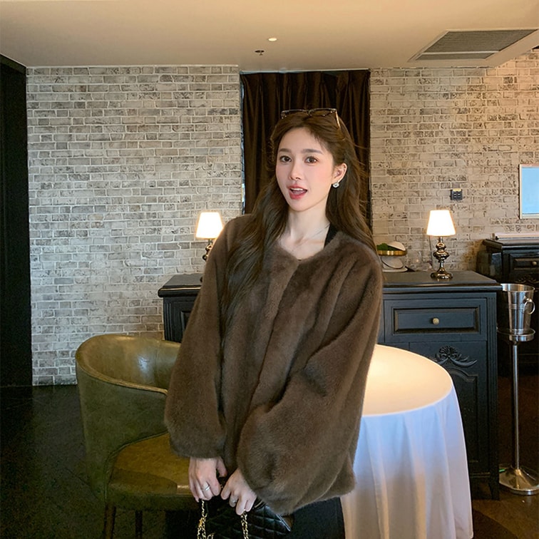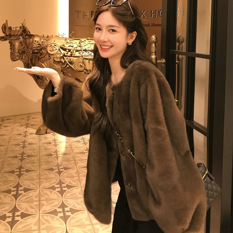【中國直郵】 HSPM 新款中古風仿水貂短版環保貂皮大衣寬鬆毛毛草外套 咖色 S