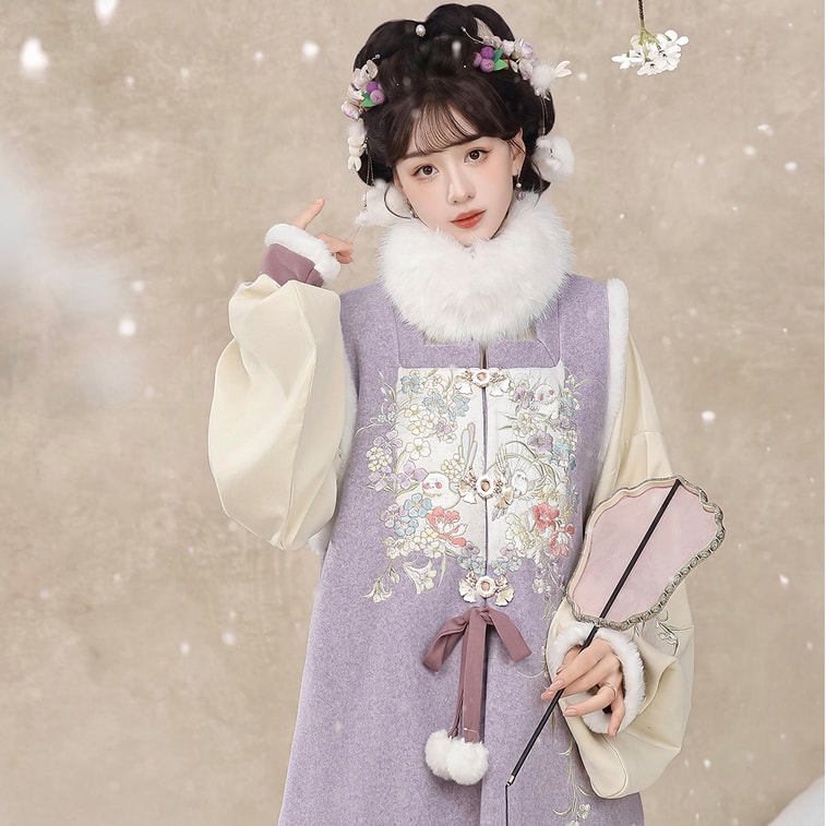 【中國直郵】 HSPM 新款明製原創漢服女加絨長比甲馬麵裙套裝 紫色四件套 XL