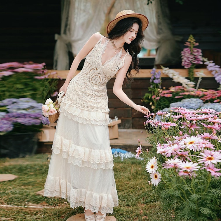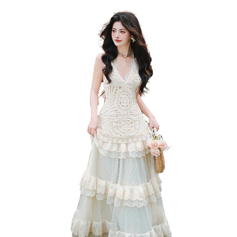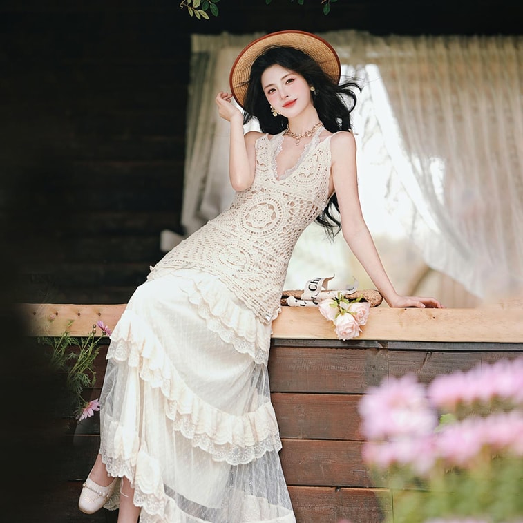 【中國直郵】 HSPM 新款純欲蕾絲蛋糕裙度假風套裝 三件式 F