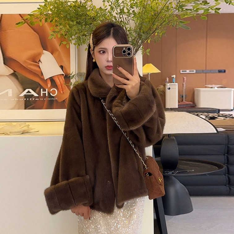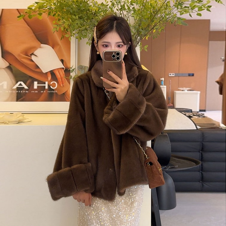 【中國直郵】 HSPM 新款加厚短版方領南瓜挽袖中古仿水貂毛絨外套 咖色 M