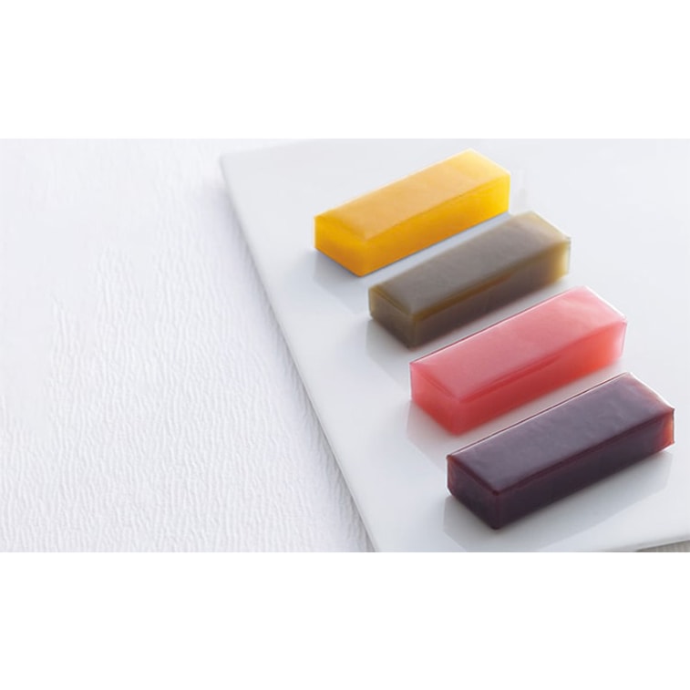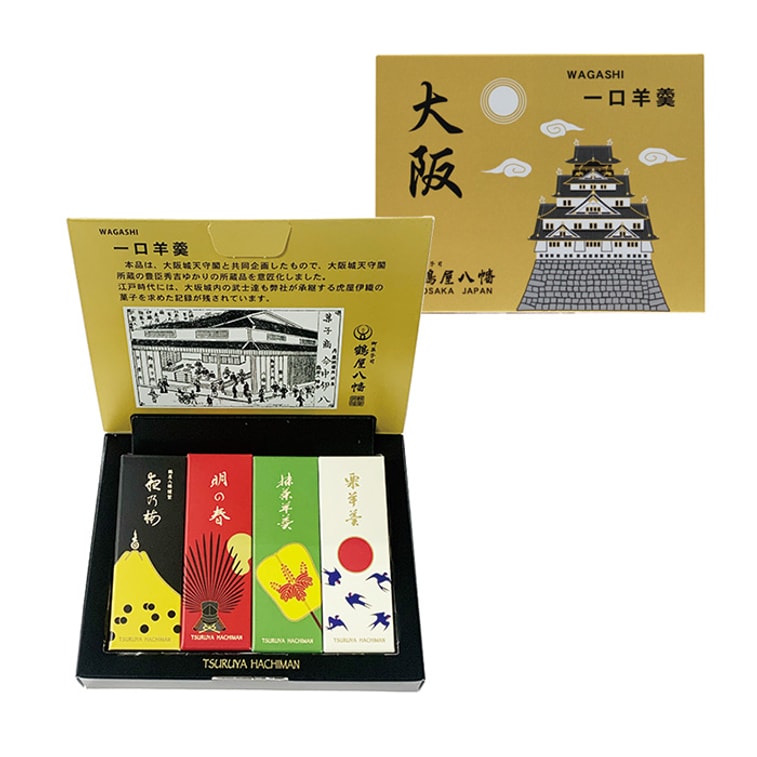 與大阪城合作推出的限量包裝。 這款羊羹的特色是口感柔軟,口感如同新鮮糖果般清爽。 夜梅羊羹、秋之春羊羹、抹茶羊羹、栗子羊羹均製成一口大小。