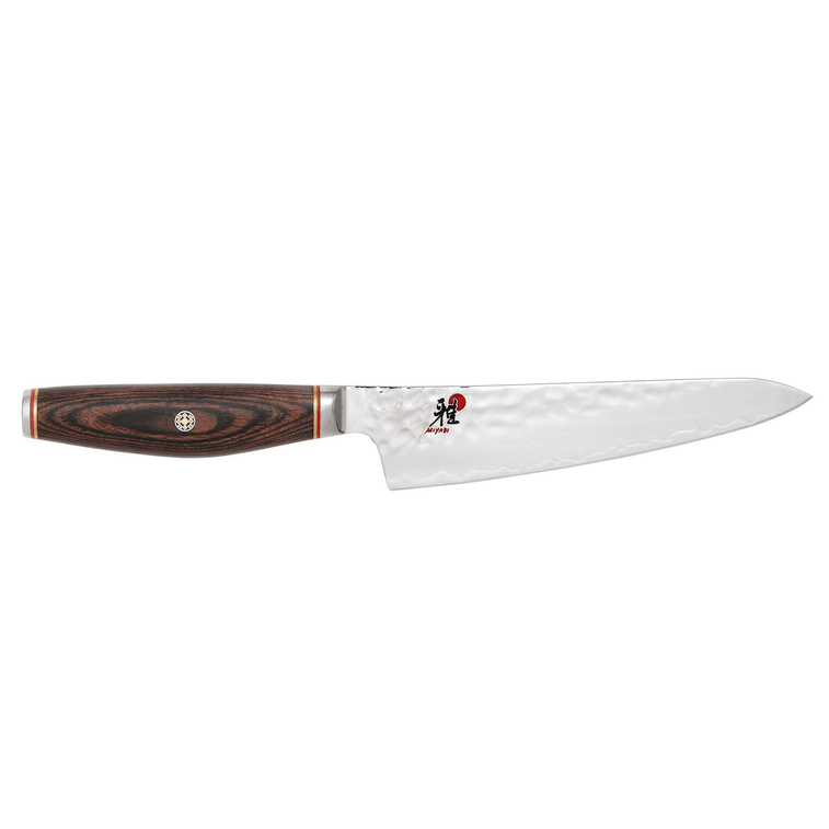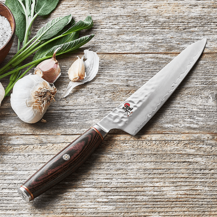SG2 微碳化粉末鋼的強大核心被包裹在土鉄面處理中。這種精美的手錘效果有助於防止食物黏在刀上。每把刀都配有手工磨削的刀刃,刀刃上有真正的刀刃,向幾個世紀前在關做的武士刀致敬。