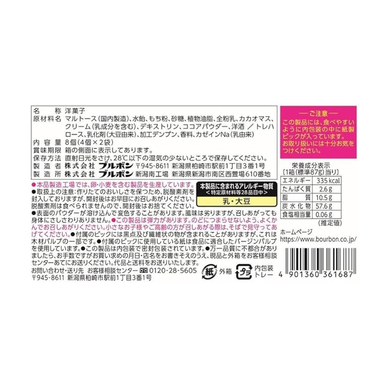 【日本直郵】 日本 BOURBON 波路夢 奶油巧克力夾心 糯米糍 大福 8個裝 2小袋/盒