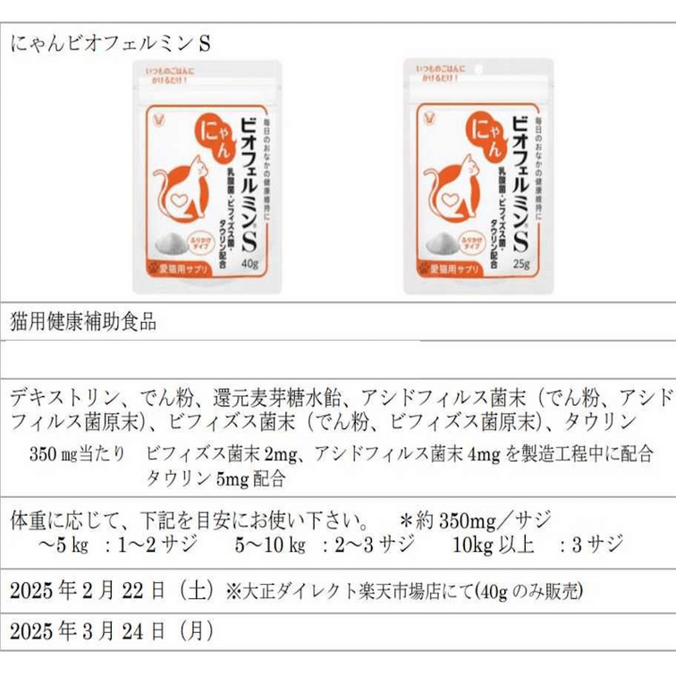 【日本直郵】 日本 TAISHO PHARMACEUTICAL CO 大正製藥 寵物貓咪用表飛鳴S腸胃健康調理粉末 乳酸菌雙歧桿菌配合 40g