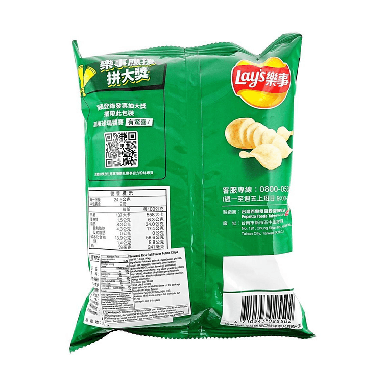 台灣版LAY'S樂事 洋芋片 特選海苔飯卷口味 海苔包飯風味 49g 【台灣棒球聯名款】