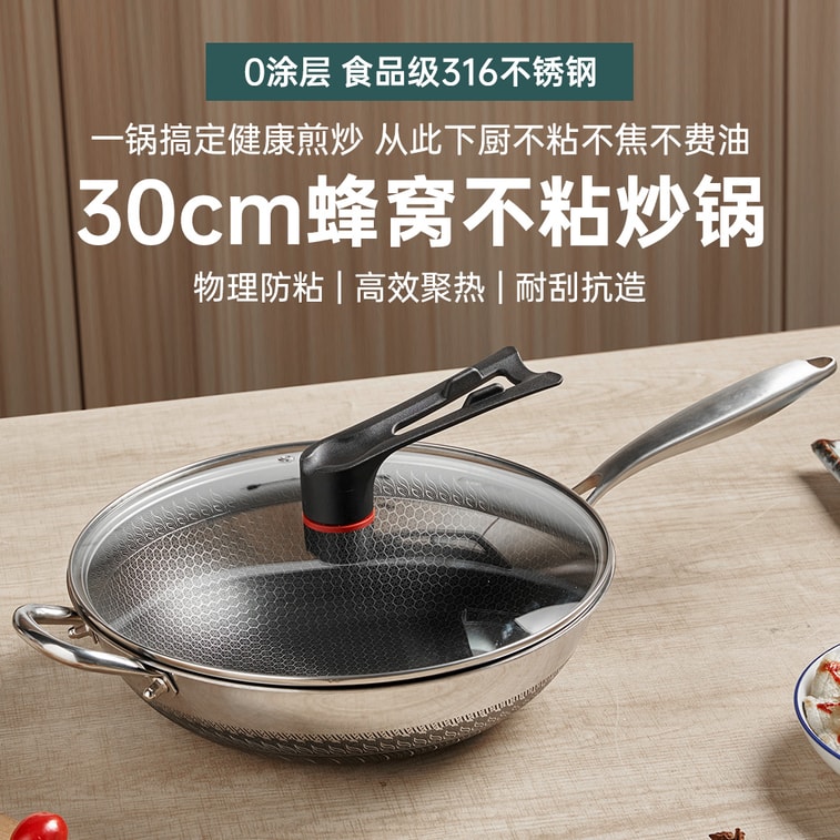 【蜂巢炒鍋+鏟匙4件套】王源吉子品牌 吉盛 32cm不銹鋼蜂窩炒鍋 物理不沾 316不銹鋼 蜂窩紋理 可立蓋 電磁爐炒鍋