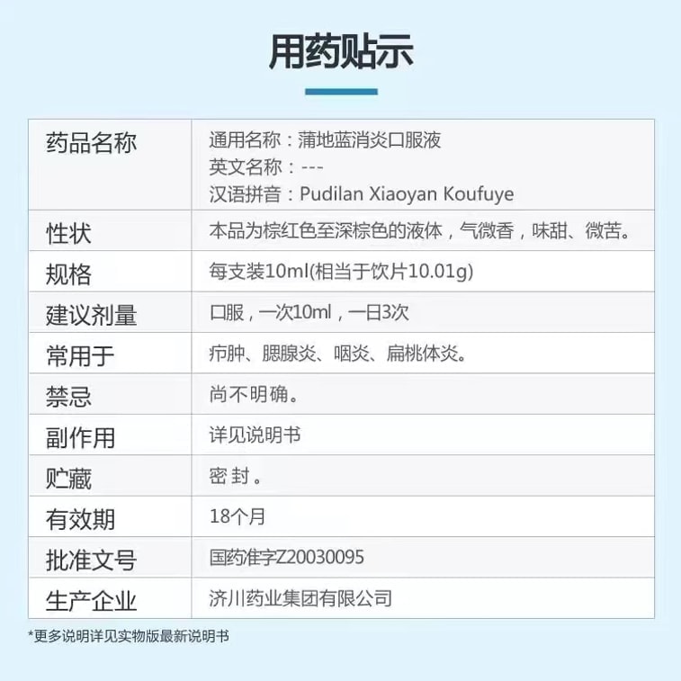 Pudilan Anti-inflammatory Oral Liquid is used for furuncles mumps and pharyngitis. 10ml*10 bottles per box