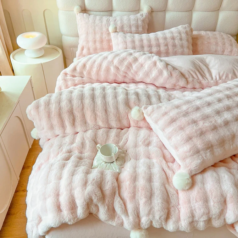【中國直郵】Lullabuy 軟糯泡芙仿皮草床品四件套秋冬床上用品床單被套居家 草莓泡芙 King Size