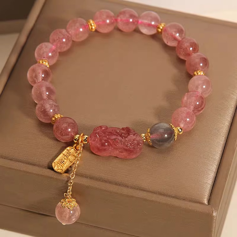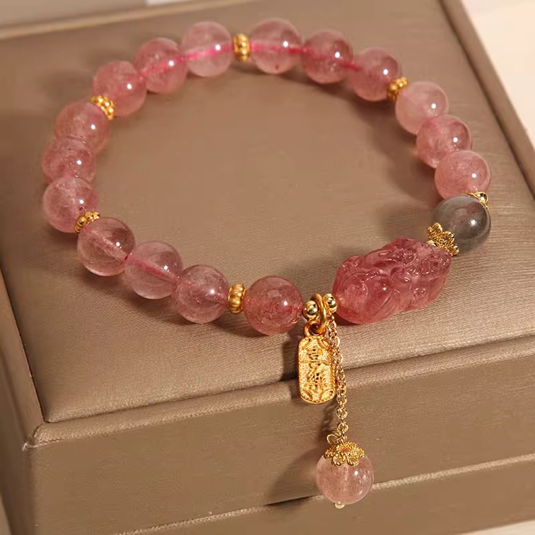 【桃子運至】普陀山開光粉水晶手鍊草莓晶8.5mm 灰月光石天然水晶能量手串 情人節送禮佳選