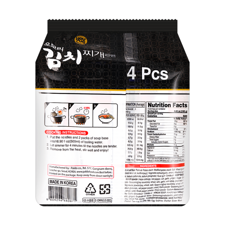 1.鍋中加入500ml清水煮沸 2.水沸後放入麵餅,調味包,煮4分鐘左右 3.放入泡菜包即可關火盛出食用 4.可依據個人喜好加入雞蛋、起司等其他配菜