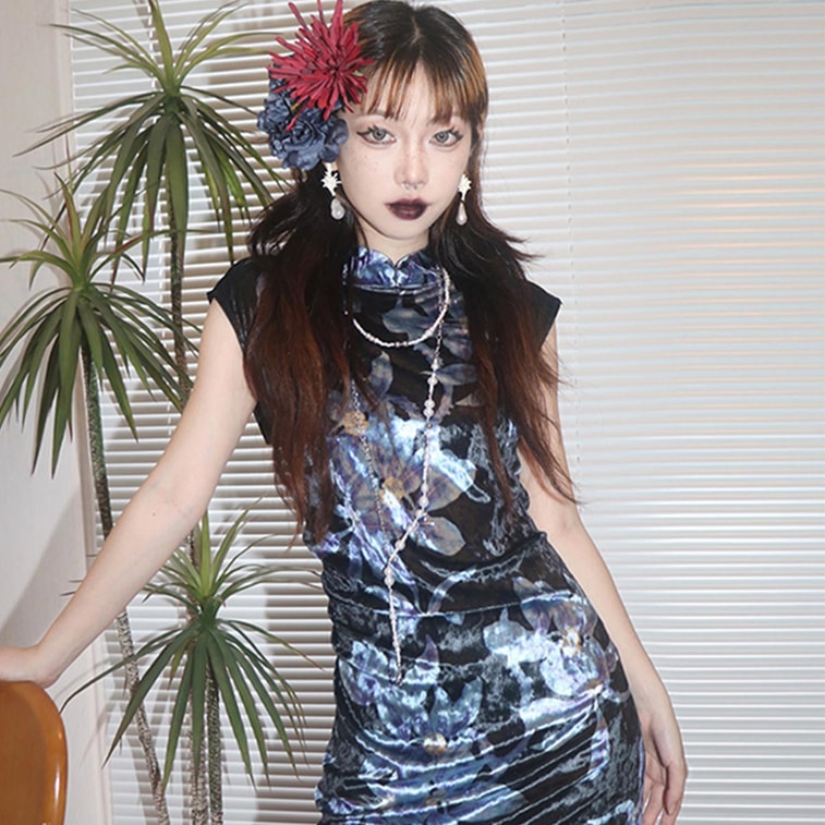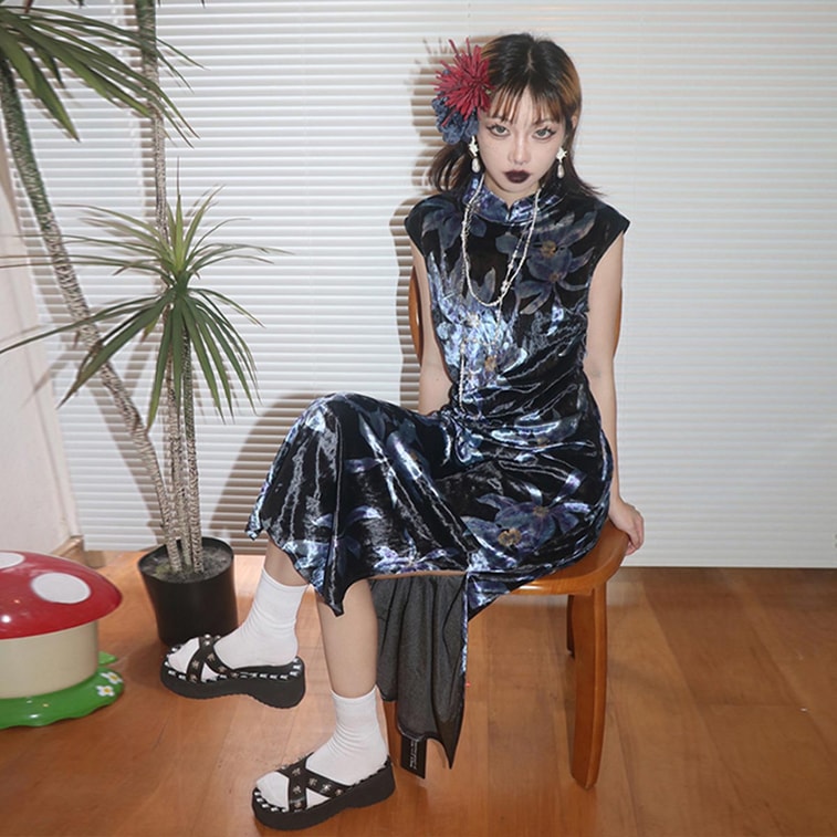 【中國直郵】 HSPM 復古新中式連身裙 藍色花絲絨長裙 辣妹風改良旗袍 深藍花M