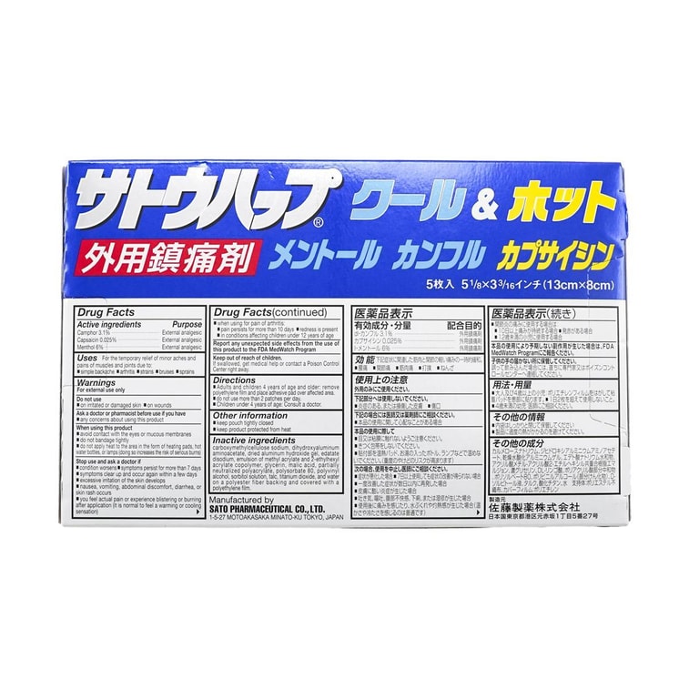 日本SATO佐藤 止痛藥貼 關節痛止疼藥貼 緩解肌肉疲勞 酸痛肩頸痛減輕 舒緩發炎 5錠 快速起效 清涼舒適