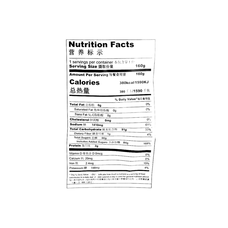 *免責聲明:本頁面所展示的營養成分資訊來自商品包裝,僅供參考。由於包裝版本、語言或拍攝方式的差異,內容可能存在偏差或顯示不完整,請以實際收到的商品包裝為準。若對成分、過敏原或適用族群有疑問,建議於使用前仔細閱讀包裝說明,或聯繫客服取得協助。