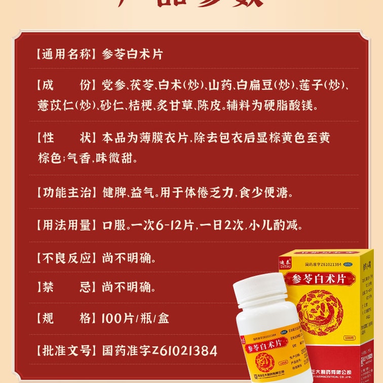 | 規格 | 參苓白片 100片/瓶/盒 |