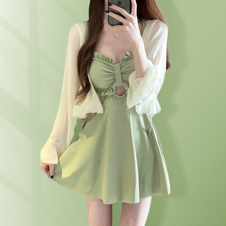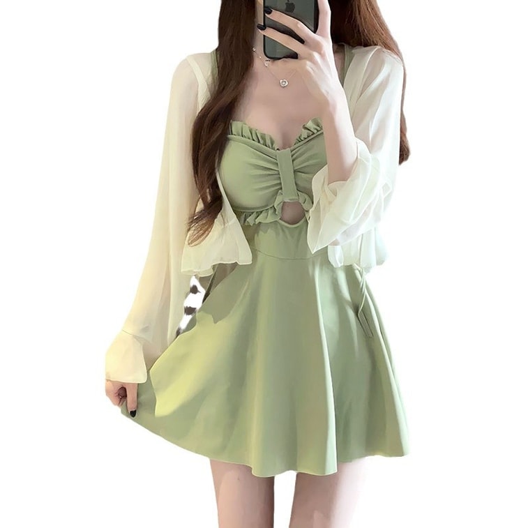 【中國直郵】 爪哇島 游泳衣女 連體保守防曬罩衫顯瘦遮肉性感網紅高級感純欲泡溫泉泳裝 酪梨綠(含罩衫)M碼 1件