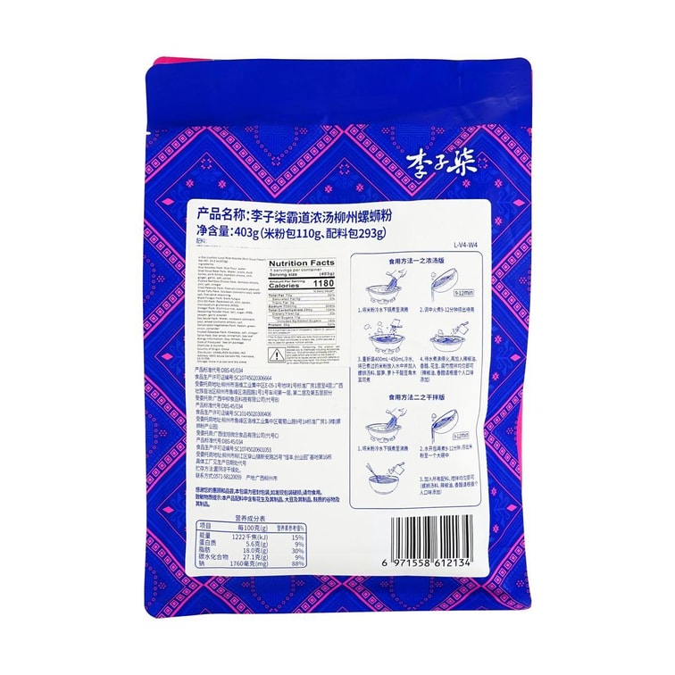 常規吃法: 1.將米粉冷水下鍋煮至沸騰,調中火煮約9-12分鐘撈出待用 2.重新裝400ml左右冷水,將已煮過的米粉放入水中並加入螺螄湯料、 酸筍、酸豆角木耳蘿蔔乾同煮 3.待水煮沸停火,再加入辣椒油、香醋、花生、腐竹攪拌均勻即可 (辣椒油、香醋請依個人口味添加) 創意乾撈粉: 將米粉冷水下鍋煮沸約8-10分鐘, 瀝乾水撈出,加入配料,攪拌均勻即可食用 微波爐吃法: 1.取適合微波爐使用的大碗一個 2.在碗中放入米粉,注入適量的開水,水要沒過米粉 3.將碗放入微波爐內,高火約7-8分鐘 (涼水煮需約12-13分鐘) 4.「叮」時間到,小心取出燙手的碗,配料放入攪拌均勻即可食用
