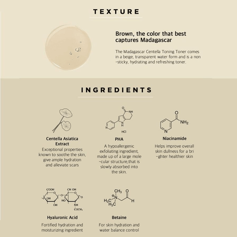 一款溫和的PHA爽膚水,能夠同時舒緩、去角質、保濕和提亮肌膚。含有84%積雪草萃取、玻尿酸、甜菜鹼,以及其他美白和抗老成分,打造清新、柔嫩、無皺紋的肌膚效果。使用方法:取適量於化妝棉上,輕拭潔面後的臉部,輕拍以促進最佳吸收。