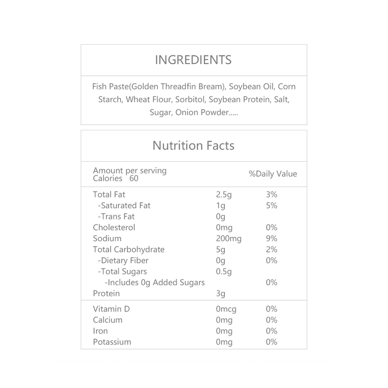 | 原料成分 | 魚糜、大豆油、小麥粉、鹽、糖等。 |