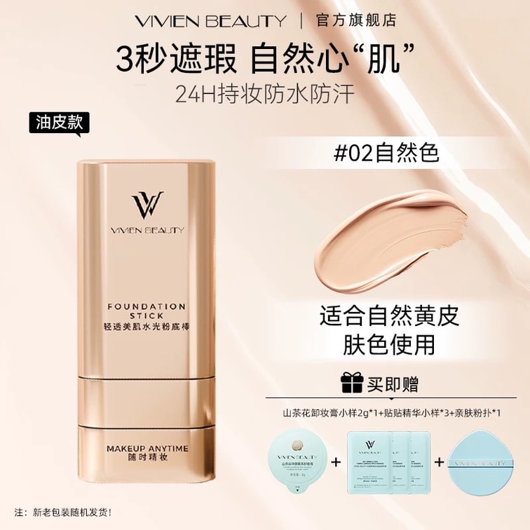 【中國直郵】 vivien beauty 輕透亮採粉底棒 韓女同款 10s速成懶人妝 遮瑕神器 輕鬆打造水光肌#02自然色 1支裝